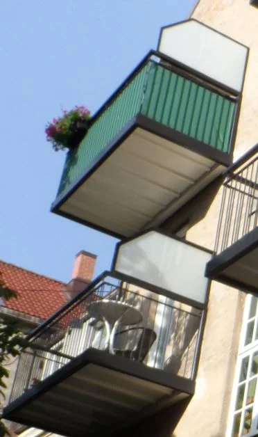 - Alt balkongtilbehør skal monteres og brukes på balkongens innside, bortsett fra balkongflagg, som kan festes forsvarlig til rekkverket og henge ut over fortauet. Kun balkongduker, sammenleggbare sidemarkiser og blomsterkasser som er godkjent av styret og tilpasset balkongen og fasaden forøvrig, skal benyttes. Styret kan utarbeide retningslinjer for balkongtilbehør.